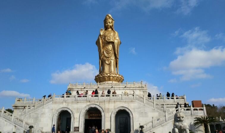 2、普陀山,位于浙江省舟山市普陀区,杭州湾南缘,舟山群岛东部海域,地处北纬29°58′3″-30°02′3″,东经122°21′6″-122°24′9″,相传是观世音菩萨教化众生的道场。