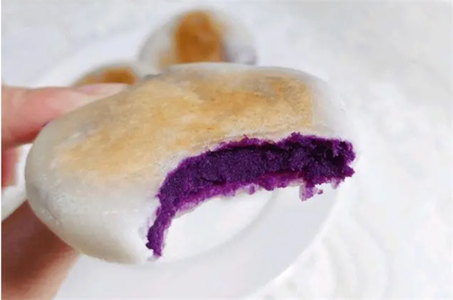 3. 将面团分成小份,包入紫薯泥,压扁后在平底锅中煎至金黄色。