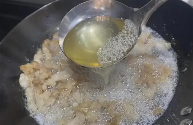 在熬制猪油时,很多人会等到将猪油渣全部炸干后才离火,这是不正确的方法。长时间加热会导致猪油氧化,不仅颜色会变黄,味道还会变酸,使猪油容易变质。因此,只要有猪油被熬出,就应该立刻舀出并放凉,以避免过度加热。这样制作出的猪油才是雪白的,味道浓香。