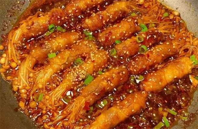 将金针菇切段,肥牛片卷起。热锅凉油,加入大蒜、郫县豆瓣酱炒香,放入卷好的肥牛,煎至定型后翻面再煎,调入料汁,小火煮五分钟,撒上葱花芝麻即可。